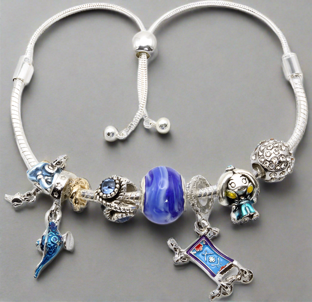 This charming Aladdin Sterling Silver Charm Bracelet is perfect for any occasion. Crafted with genuine silver and meticulous detail, it features classic Aladdin symbols such as Genie, Magic Lamp, Magic Carpet and Jasmine. Delicately-placed gold, blue and diamond spacers add a touch of luster. A timeless accessory for any jewelry lover.
