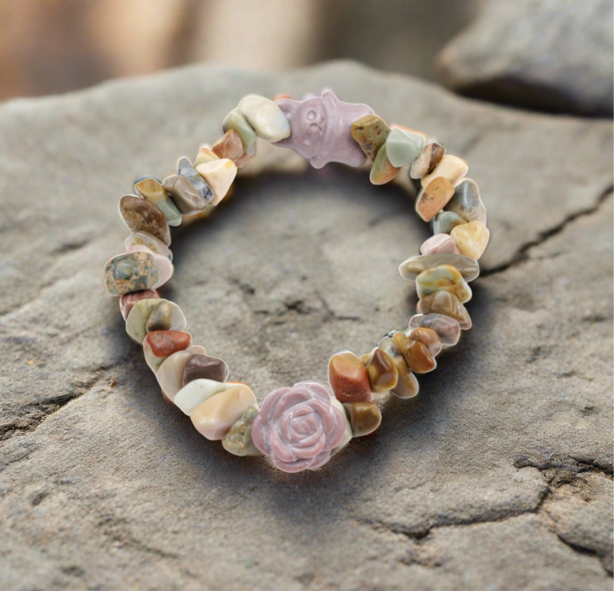 Crafted from Alashan crystal chips, this free form bracelet features a delicate Bunny and Rose design. Each chip is handpicked for its unique properties, providing a stunning and one-of-a-kind accessory. Elevate your style while harnessing the potential benefits of crystal energy.