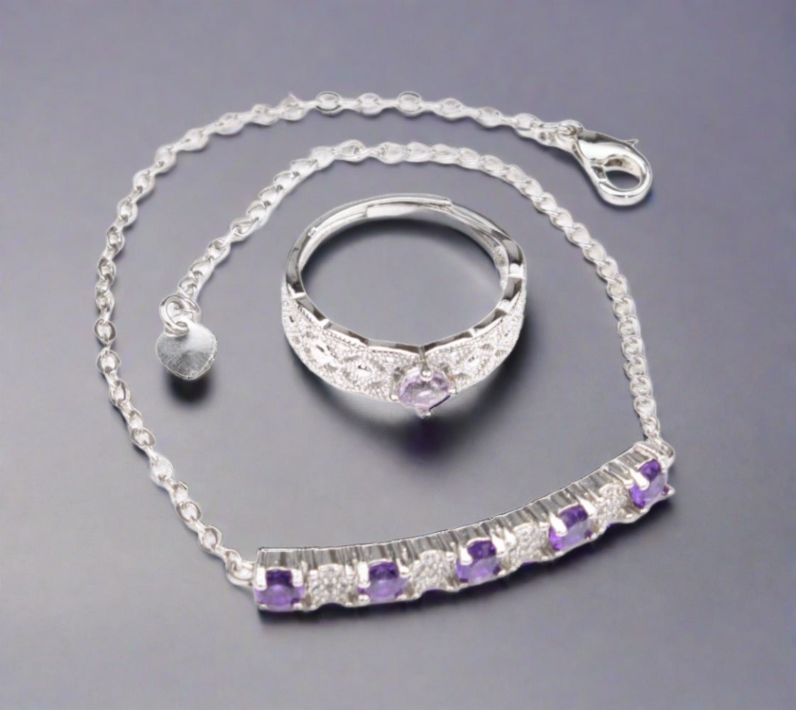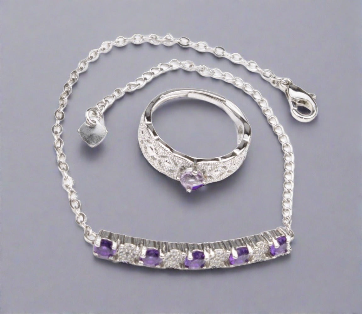 This elegant set features a shimmering amethyst and zircon ring and bracelet, crafted in silver. The adjustable ring allows for a perfect fit. Add a touch of glamour to any outfit with this stunning set.