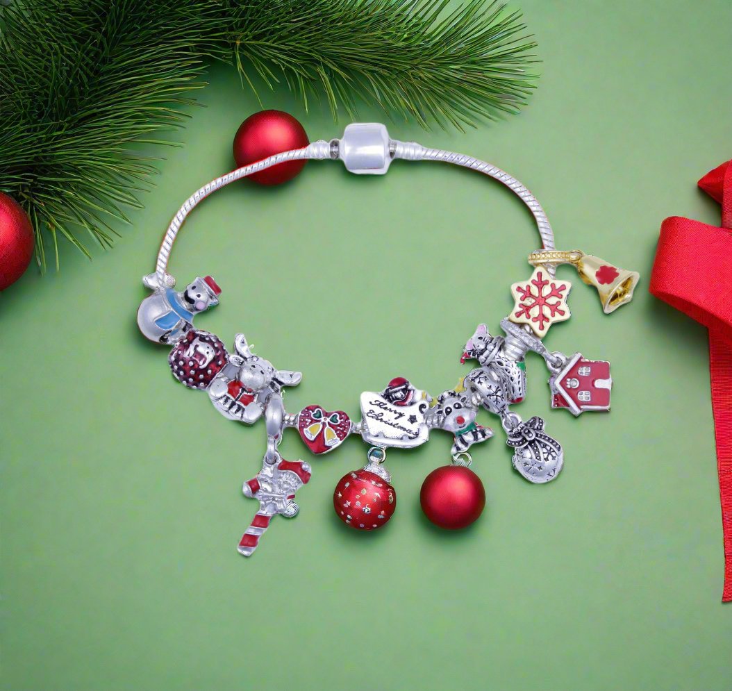 This Christmas Charm Bracelet is crafted with silver and adorned with festive charms, including Santa in a sleigh, a jolly Snowman, a majestic Reindeer, a cheerful Christmas Bell, and a delicate Snowflake. The perfect addition to your holiday ensemble, this bracelet is sure to spread joy and Christmas spirit wherever you go.