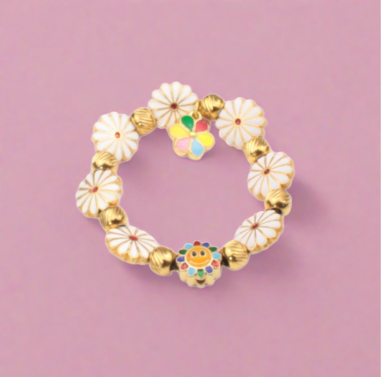 Introducing our playful Daisy Bracelet - a whimsical accessory for your little fashionista. Made from gold and enameled with daisies, this bracelet will add a touch of quirky charm to any outfit. Perfect for the youngest fashion-forward trendsetters in your life. With a colorful rainbow charm and a sunny rainbow design.