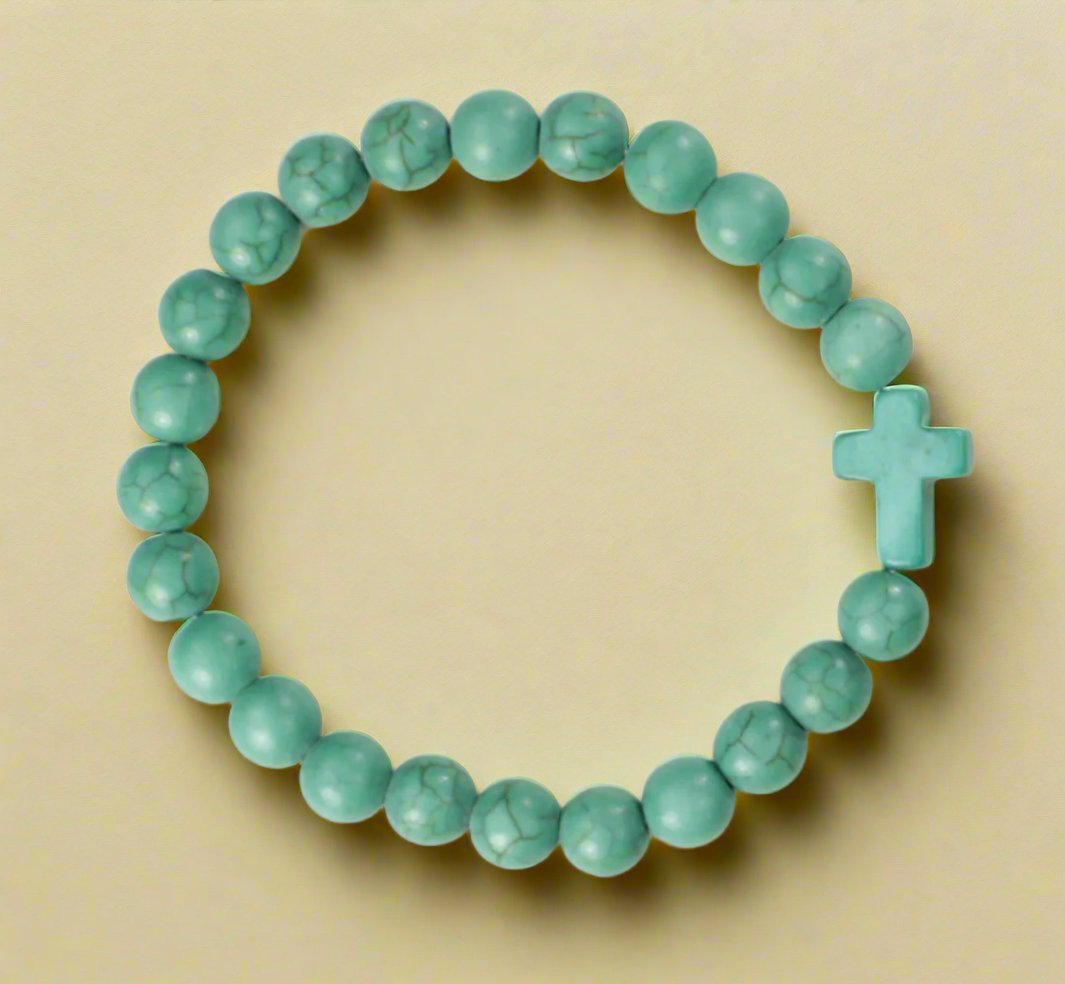 This elegant bracelet features dark green Turquois crystal beads and a stunning Turquois cross. Individually selected for their vibrant color, the beads add a touch of natural beauty to any outfit. The Turquois cross adds a symbolic element, making this bracelet both stylish and meaningful.