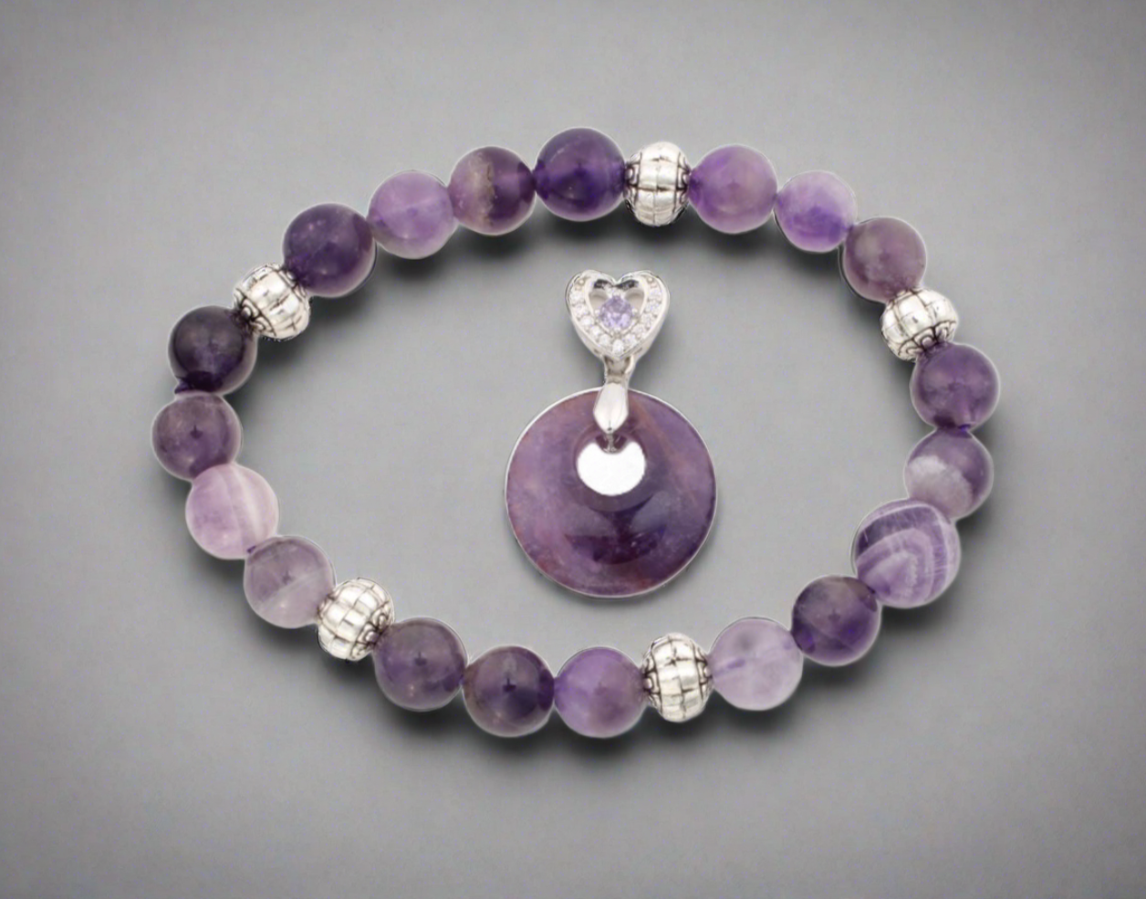 Experience the calming properties of our Dream Amethyst Bracelet & Pendant Set. The bracelet and pendant feature silver spacers and a silver zircon holder, adding a touch of elegance to the natural beauty of dream amethyst. The perfect set to add a sense of tranquility to your everyday life.
