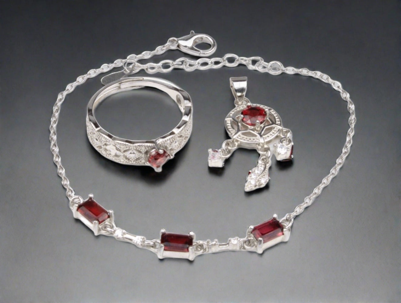 Add some sparkle to your outfit with our Garnet Set. Made with silver, this gorgeous set includes a ring, pendant, and bracelet, all featuring beautiful garnet crystal stones and sparkling zircon diamonds. Elevate your look with these elegant and eye-catching pieces.