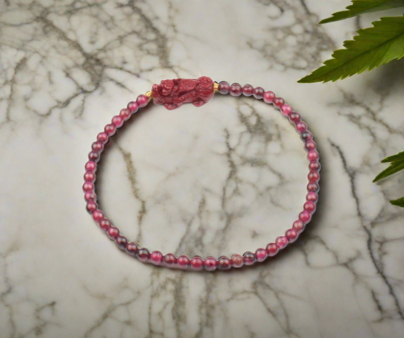 This crystal bead bracelet features vibrant 2mm Garnet beads and a striking vermillion red Pixiu Dragon made from Cinnabar gemstone. Protect yourself from negative energy while attracting good luck with this unique and playful accessory.