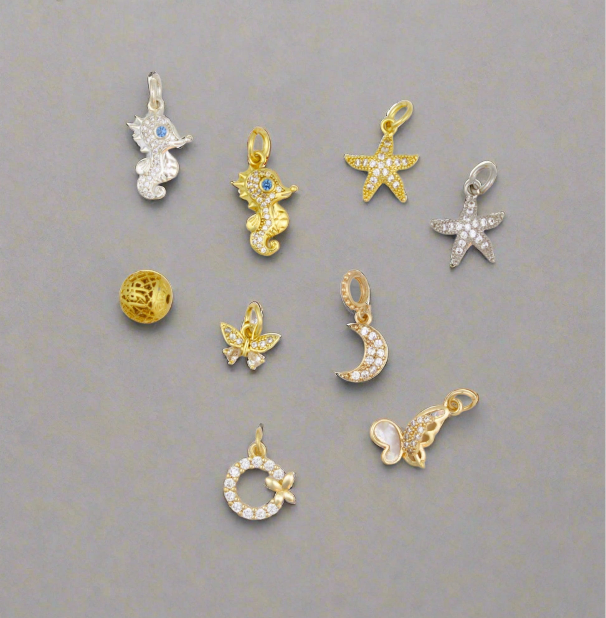 Elevate your jewelry collection with our Gold & Silver Charms / Pendants featuring stunning Zircon accents. These versatile pieces can be used as charms for bracelets or pendants for necklaces, adding a touch of elegance to any look. Choose from a variety of designs including a Gold Butterfly, Seahorse, or Starfish. Crafted with quality and style in mind, these charms and pendants are the perfect addition to any outfit.