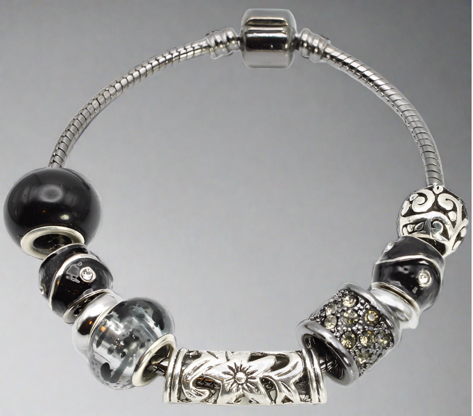 Capture unique style with this gun metal black bracelet. Featuring 7 mixed spacers and 2 stoppers for a truly unique look, including a long silver alloy flower, ball swirl, black spacers with crystals and a barrel spacer with crystals. This bracelet is sure to stand out in any outfit!