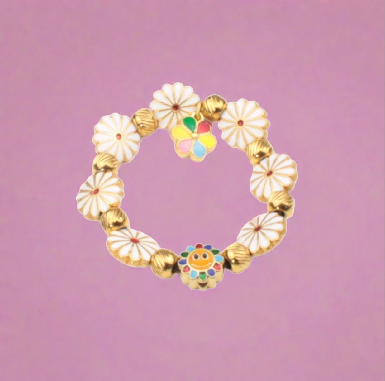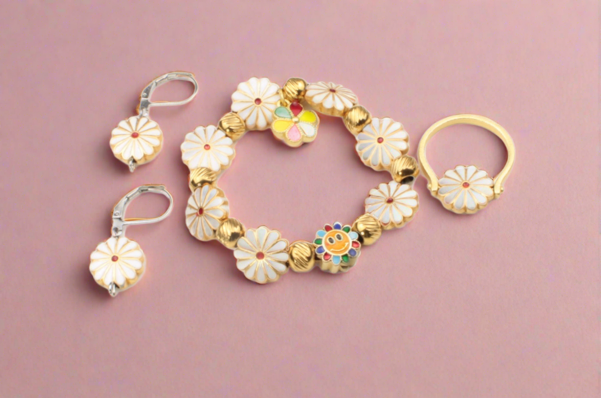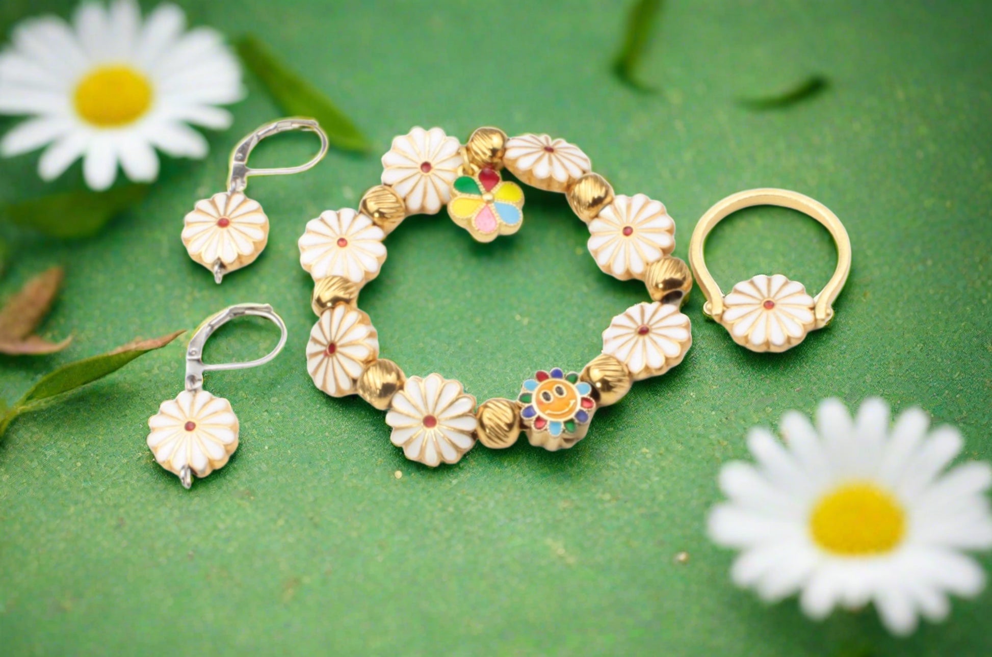 Add a touch of whimsy and color to your child's style with our Kids Daisy Set. Featuring a playful Daisy ring, charming Daisy earrings, and a fun Daisy charm bracelet with rainbow colored accents. With a gold finish and vibrant enamel, this set is sure to bring smiles and joy to your little ones!