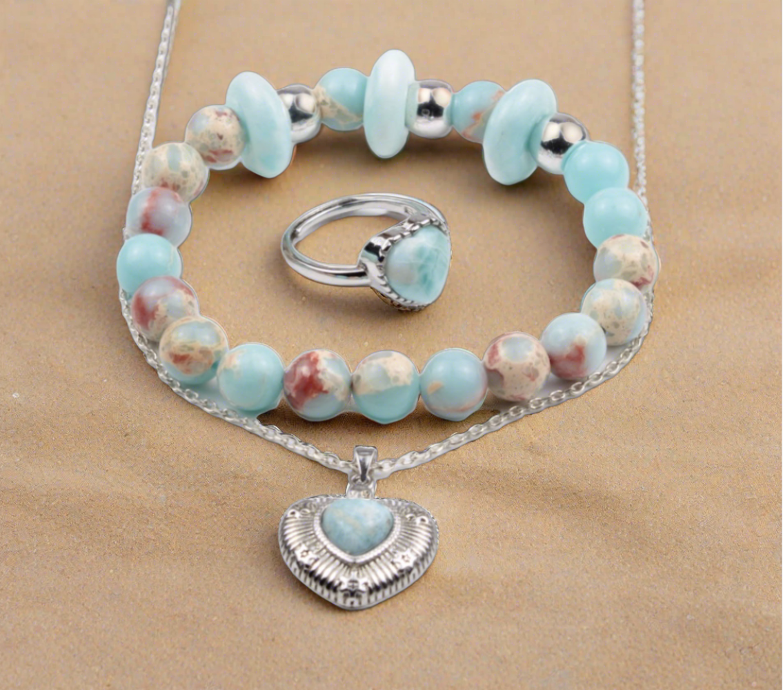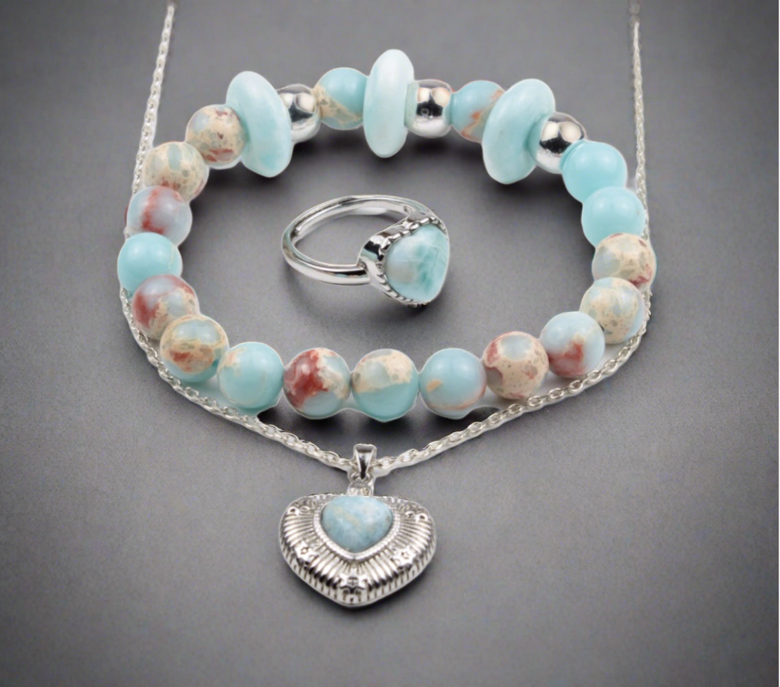 Enhance your style with this exquisite Shoushan Crystal Set. The heart pendant necklace and adjustable ring feature stunning Larimar stones set in sterling silver, while the bracelet boasts high quality Larimar beads and sterling silver spacers. Elevate any outfit with this elegant and unique set.