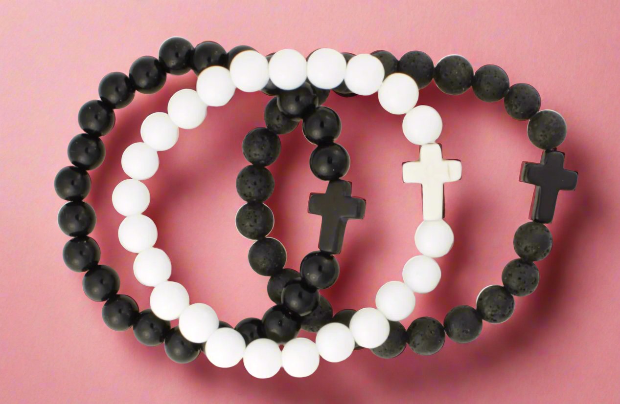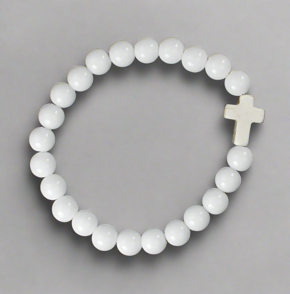 This elegant bracelet features white crystal beads made of natural stone. The delicate cross charm adds a touch of grace and spirituality to any outfit. Expertly crafted with quality materials, this bracelet is both beautiful and meaningful. Elevate your style and showcase your faith with this stunning piece.