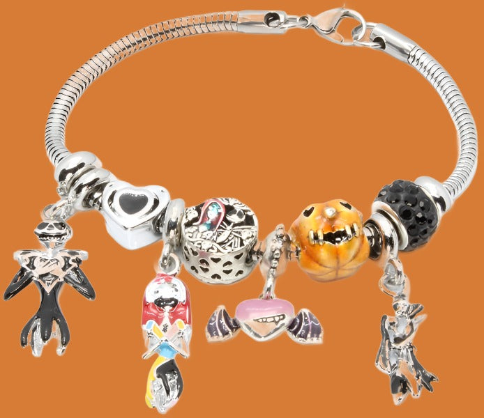 Our Nightmare Before Christmas Charm Bracelet is crafted from high-grade surgical steel and features charms of Jack & Sally, Jack O'Lantern, Bats Heart, Black Heart Diamond spacer, and Sterling Silver stoppers. The bracelet features a lobster claw closure, and is available in 6.5", 7", 7.5" and 8" sizes. The charms are constructed from sterling silver and alloy, assuring they won't tarnish over time.
