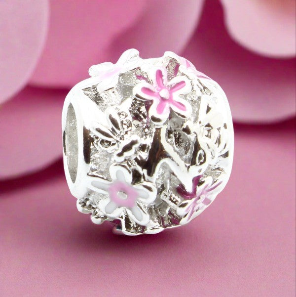 This Pink Flowers Spacer Bead features a gorgeous round spacer bead adorned with pink flowers, crafted with sterling silver for a touch of elegance. Perfect for any jewelry creation.
