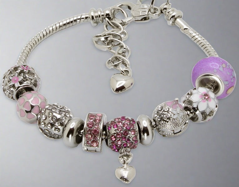 The Pinkin Charm Bracelet is crafted from a base metal silver tone and decorated with a variety of delightful flowered and diamond pink charms. Its beautiful design is sure to add a touch of elegance to any outfit.