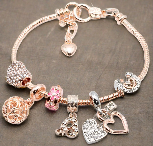 Our Rose Gold Love Charm Bracelet is an elegant piece featuring a romantic design of a heart-shaped diamond-studded charm, heart ball charm, linked hearts, and rose gold heart lock, with a classic lobster claw clasp. Crafted from rose gold-plated alloy with diamond accents, and finished with a rose gold flowered diamond stopper, it's perfect for any special occasion.