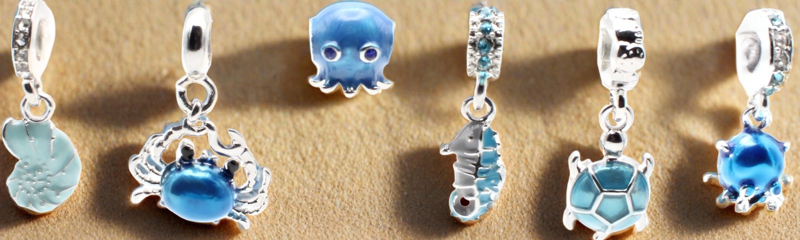 These intricate Sea Creature Charms are crafted from 925 sterling silver and accented in enamel for a beautiful and unique look. Choose from a conch shell, a crab with silver and blue enamel, a starfish, a turtle, and an octopus with a silver and blue enamel body, to make any jewelry set stand out.