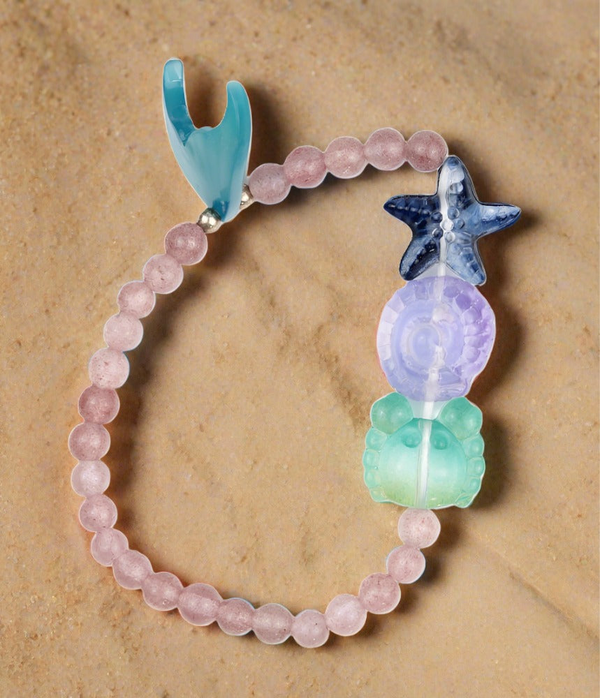Add a touch of ocean fun to your child's style with our Strawberry Quartz Crystal bead bracelet featuring adorable sea creature charms and a playful Mermaid tail. The 4mm beads add a delicate touch, making it a perfect accessory for any occasion. Dive into style with this charming bracelet!