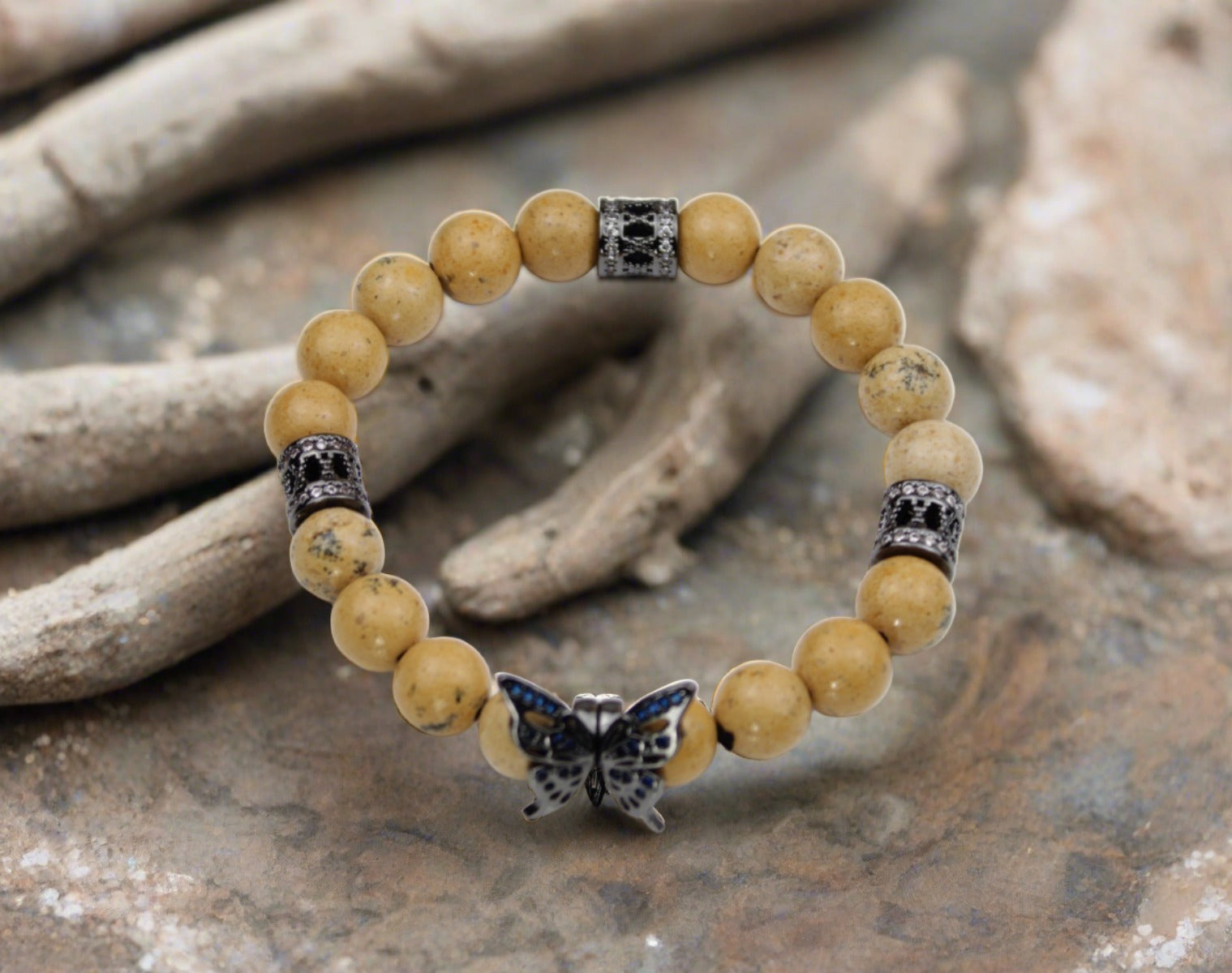 Experience the healing and grounding energies of our Yellow Artistic Jasper Bead Bracelet. The 8mm beads feature a beautiful black butterfly with a Blue Zircon, and black spacers with Zircon accents. Perfect for adding a touch of natural beauty to any outfit.